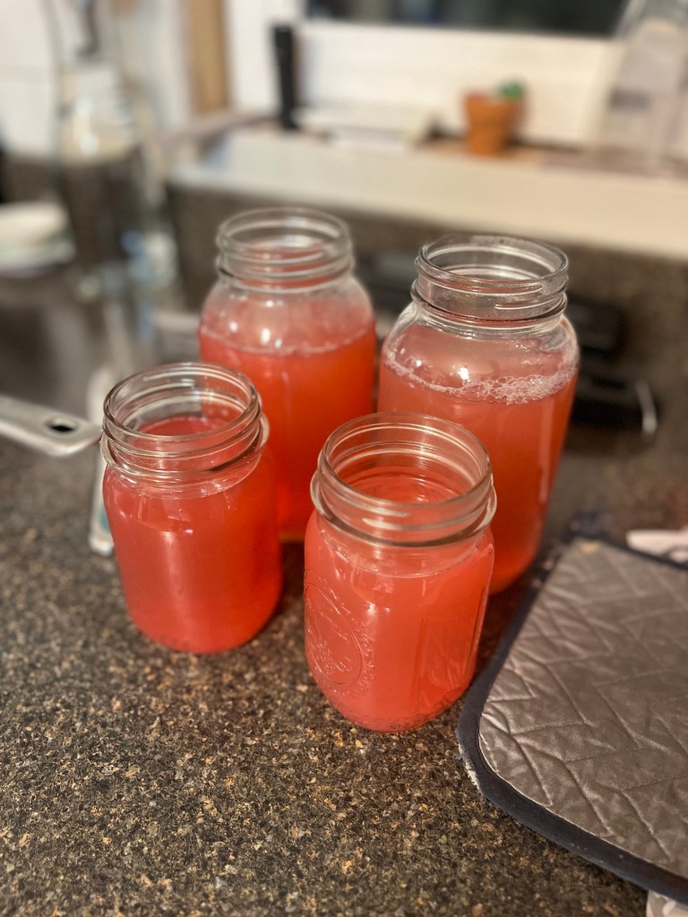 This is our first year canning wild plum jelly. It was a little on the tart side, but spread on a piece of warm homemade bread, it is excellent. We used a Finnish juicer from my mother to make this neon jelly.